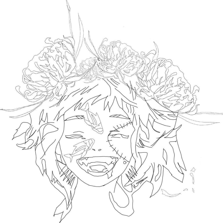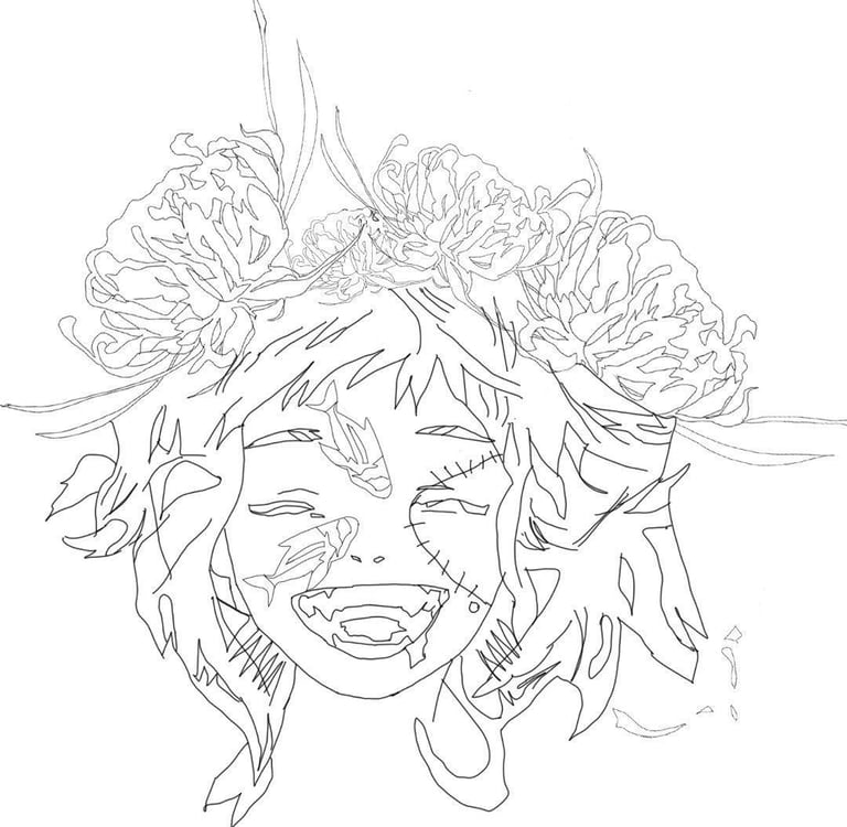 Organic elements grow through and around the figure, reflecting states of vulnerability, healing, and internal change.